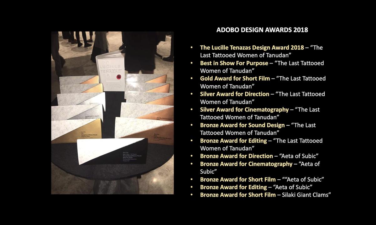 Adobo Design Awards 2018 - Lucille Tenazas Design Award, Best in Show For Purpose, Gold Award for Short Film, Silver Award for Direction, Silver Award for Cinematography, Bronze Award for Sound Design, Bronze Award for Editing